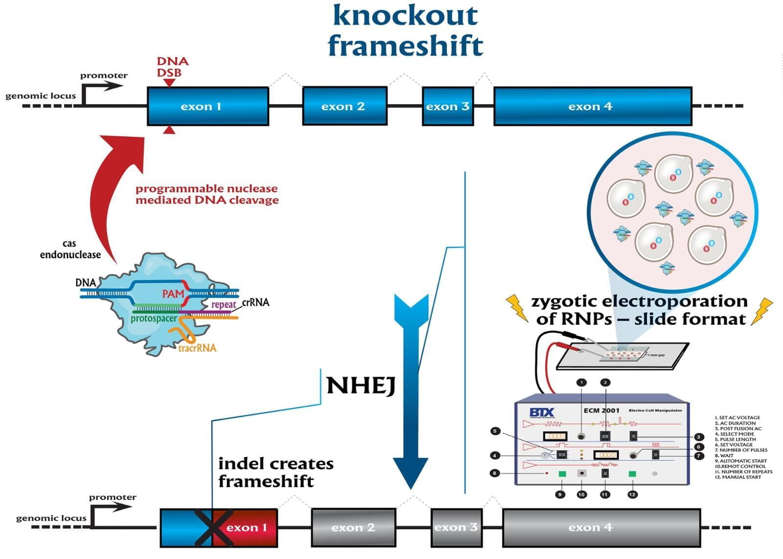 The service includes disruption of the translational reading frame such as simple frameshifting mutations that cause a nonsense mutation, which results in a shorter protein chain because of an early stop codon. Design of a single effective guide RNA causes the protein's reading to be shifted via the introduction of a double-stranded DNA break and repair by non-homologous end joining (indels). Microinjection is performed as a per session service with a total of 500 zygotes injected.