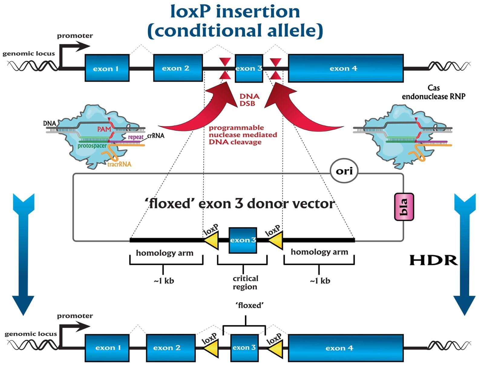 SSR knock-in custom strain mice production via microinjection of the repair template/Cas RNP complex. The service includes donor vector or long single-stranded DNA (lssDNA) construction, guide RNA design using the latest design guidelines, i.e. full-length guides, chemically modified gRNAs, truncated sgRNAs, hp-sgRNAs (hairpin-sgRNAs), that produces high on-target activity in our surrogate cell-based gene editing assay while limiting off-target activity.